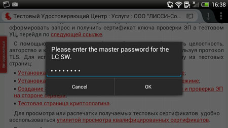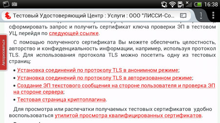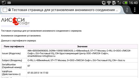 К сожалению, в Mozilla Firefox для Android сегодня отключен функционал для работы с сертификатами (certManager), отсутствуют средства выбора сертификатов при авторизованном доступе по https и некоторые другие возможности. Однако несмотря на это, при использовании Mozilla Firefox на Android можно получить доступ в анонимном режиме по https к веб-порталам, работающим по анонимному https на базе российской криптографии. Для того, чтобы убедится в этом, достаточно зайти на страницу тестового УЦ ООО «ЛИССИ-Софт» и выбрать пункт меню «Установка соединений по протоколу TLS в анонимном режиме»: