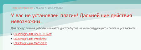 Для доступа к сервису предварительно надо установить плагин LSLicPlugin - единственный продукт от ООО «ЛИССИ-Софт», который не требует лицензии и свободно распространяется. Дистрибутивы плагина LSLicPlugin доступны для скачивания при условии, что у пользователя еще не установлен плагин, на странице «Лицензировать и скачать продукты».