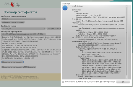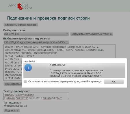 В связи с этим специалистами ООО «ЛИССИ-Софт» реализована поддержка криптографических механизмов электронной подписи (ЭП) в программный - LS11SW - и программно-аппаратные PKCS#11-токены - LS11_HW. Это в свою очередь сделало возможным добавить поддержку электронной подписи ГОСТ Р 34.10-2012 в Криптоплагин LCSignPlugin: