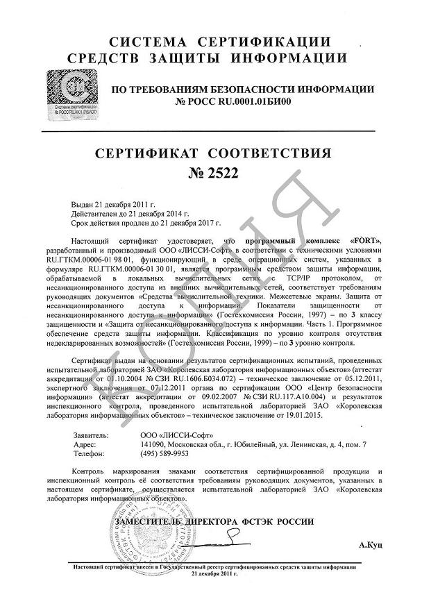 Программный комплекс «FORT» (МЭ «FORT») является программным средством защиты информации ограниченного доступа, обрабатываемой в локальных вычислительных сетях с TCP/IP протоколом от несанкционированного доступа из внешних вычислительных сетей, соответствует требованиям руководящих документов «Средства вычислительной техники. Межсетевые экраны. Защита от несанкционированного доступа к информации. Показатели защищенности от несанкционированного доступа к информации» (Гостехкомиссия России, 1997) – по 3 классу защищённости и «Защита от несанкционированного доступа к информации. Часть 1. Программное обеспечение средств защиты информации. Классификации по уровню контроля отсутствия недекларированных возможностей» (Гостехкомиссия России, 1999) – по 3 уровню контроля. (Сертификат соответствия №2522 от 21.12.2011 г. действителен до 21.12.2017 г.).