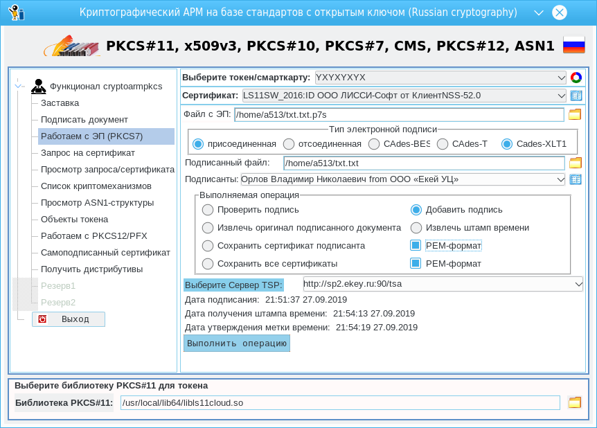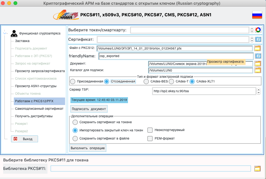 Криптографический АРМ cryptoarmpkcs на базе стандартов с открытым ключом