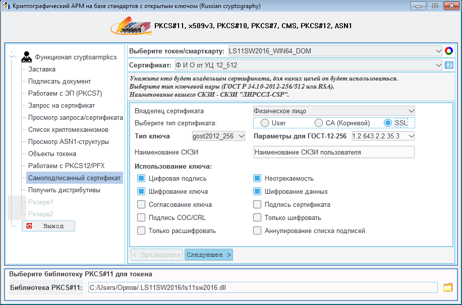 В качестве криптографического ядра используется либо криптографический токен PKCS#11, с поддержкой российской криптографии, имеющийся у пользователя, либо СКЗИ «ЛИРССЛ-CSP» .