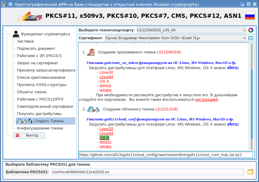 Утилита cryptoarmpkcs поможет вам также установить программный токен LS11SW2016 и/или получить облачный токен LS11CLOUD: