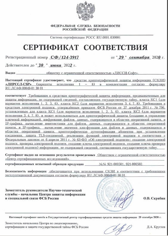 29 сентября 2020 г.) на многофункциональное СКЗИ «ЛИРССЛ-CSP».