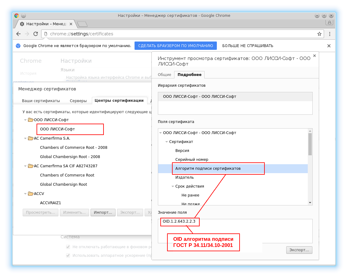 Именно библиотека NSS отвечала в браузерах Chrome от Google за реализацию как протокола https, так и работу с хранилищем сертификатов. База данных NSS (хранилище сертификатов) для браузерах Chrome от Google хранится в каталоге /$HOME/.pki и включает в себя базу данных cert9.db, в которой хранятся сертификаты, включая корневые, и key4.db, в которой хранятся закрытые ключи, поддерживаемые встроенным криптоядром. В каталоге /home/$HOME/.pki хранится еще файл pkcs11.txt, в котором прописываются библиотеки PKCS#11, для подключаемых устройств PKCS#11. Именно в этот файл надо добавить путь к библиотеке PKCS#11 токена, реализующего российские криптографические стандарты ГОСТ Р 34.10-2012, ГОСТ Р 34.11-2012, ГОСТ Р 34.12-2015 и ГОСТ Р 34.13-2015, а также ГОСТ Р 34.10-2001, ГОСТ Р 34.11-94 и ГОСТ 28147-89: