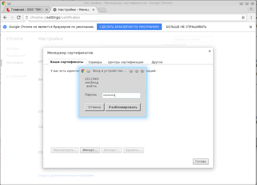 И так, если после подключения токена (добавления соответствующих директив в файл pkcs11.txt) запустить браузер GoogleChrome и в адресной строке ввести: