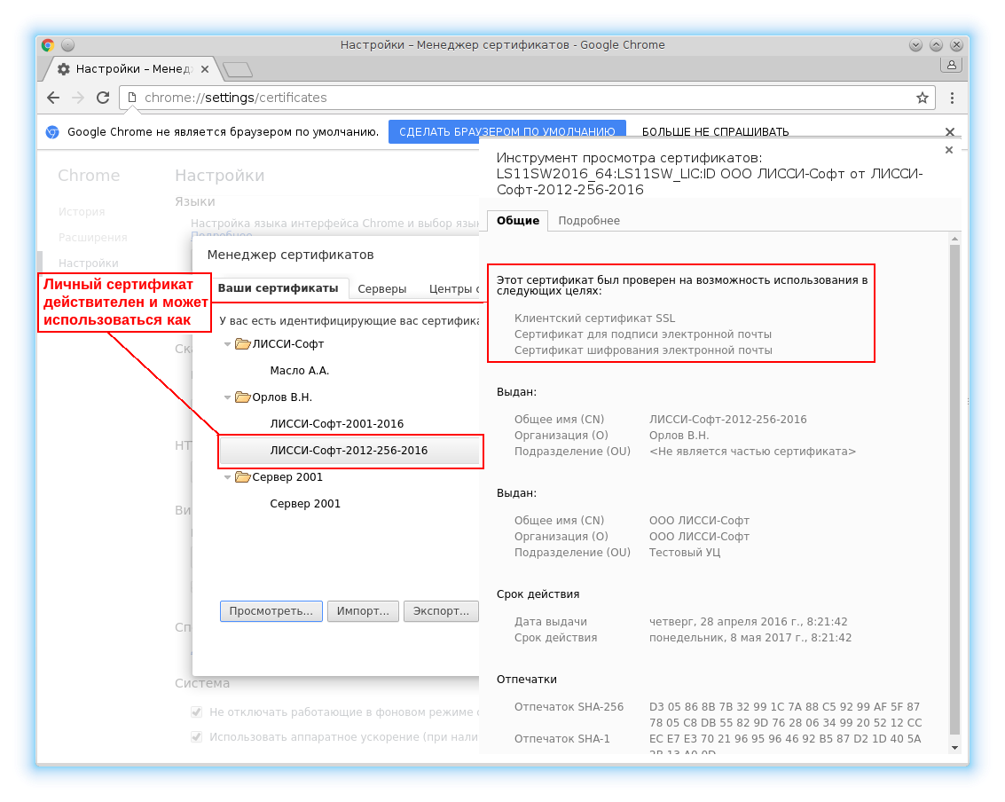 Личные сертификаты пользователя естественно хранятся на подключенном токене. Есть определенная проблема: как сертификаты и ключи появятся на токене. Формально в браузерах Chrome от Google можно импортировать личные сертификаты из контейнеров PKCS#12. Но где взять эти PKCS#12, а если токен с неизвлекаемым ключом и самое главное сейчас механизм PKCS#12 в браузерах Chrome от Google не понимает ГОСТ-овых сертификатов и ключей, необходимо модификация модуля nsPKCS12Blob.cpp. Есть простой и элегантный путь – положить личные сертификаты на токен, скажем, с использованием браузера Redfox. И так токен подключен и мы просматриваем личные сертификаты:
