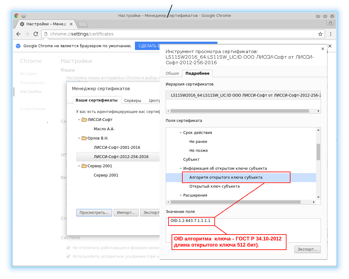 Как говорилось выше, за реализацию собственно протокола HTTPS в браузерах Chrome от Google отвечает библиотека BoringSSL. А библиотека BoringSSL сегодня поддерживает только ключи типа RSA и ECDSA и тем более ничего не знает про российские шифрсьюты TLS_GOSTR341001_WITH_28147_CNT_IMIT и TLS_GOSTR341112_256_WITH_28147_CNT_IMIT (GOST2001-GOST89-GOST89, GOST2012-GOST8912-GOST8912 — в терминологии OpenSSL ).