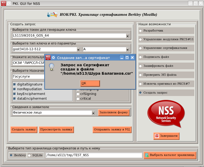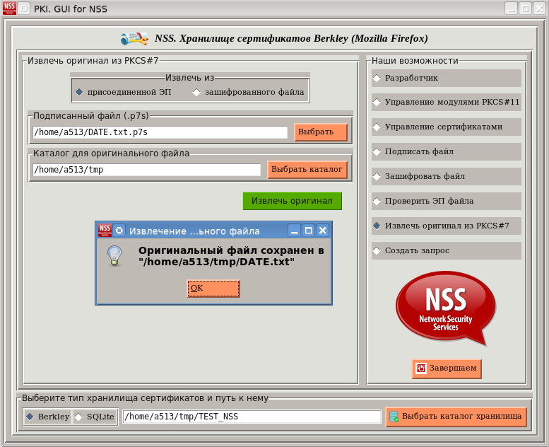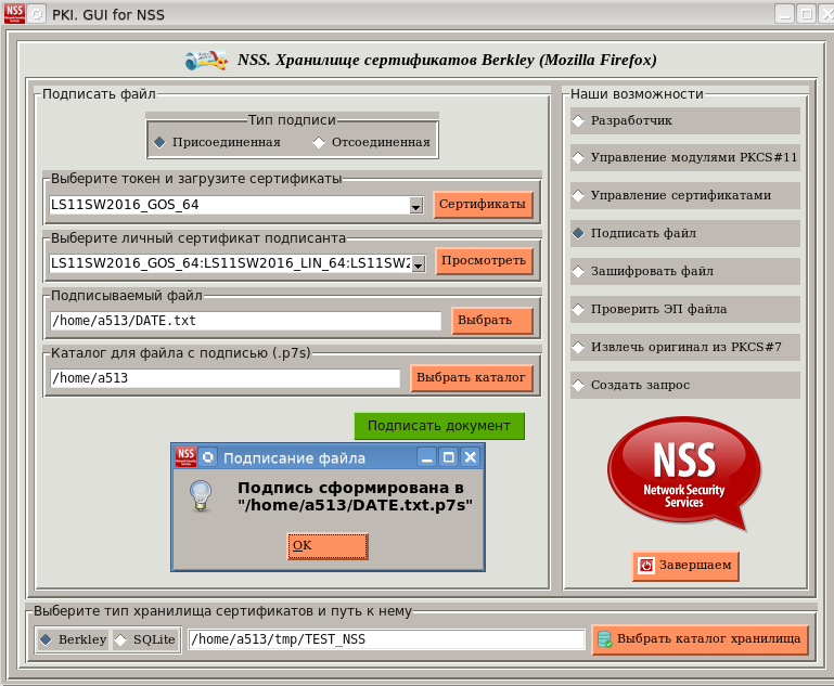 Разработана также графическая утилита GUINSS, которая позволяет, в частности, подписывать документы, проверять электронную подпись и т.д: