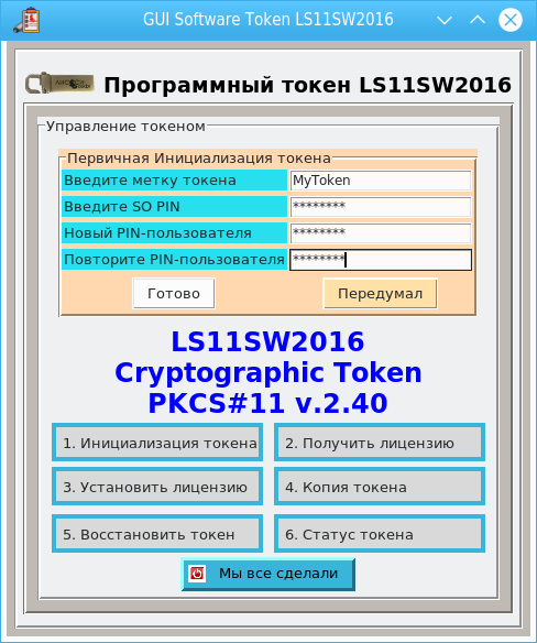 Другой способ создания программного токена LS11SW2016 состоит в использовании графической утилиты guicreate_sw, ссылки для скачивания инсталляторов которой тоже даны в конце страницы. Утилита является самодостаточной, для ее использования ничего дополнительного ставить не надо. Достаточно скачать, запустить и следовать указаниям утилиты:
