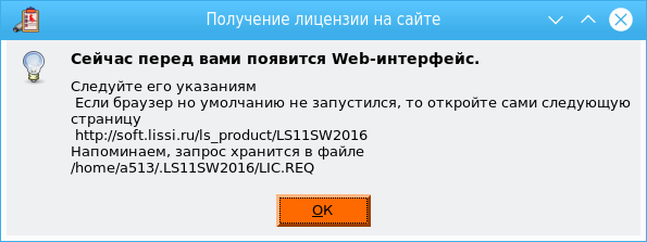 После нажатия кнопки "ОК", будет предложено пересохранить запрос на лицензию в удобном месте (это необязательно). В итоге после двух информационных сообщений на экране появится следующее окно: