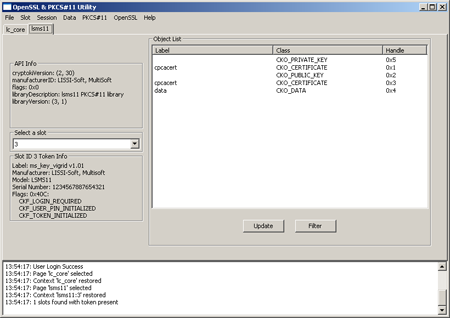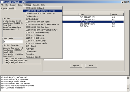 Если активен контекст PKCS#11 (открыта и выбрана соответствующая страница библиотеки PKCS#11 в главном окне), то доступны операции PKCS#11 и OpenSSL, причем операции OpenSSL выполняются через ENGINE lc_p11_core, связанный с соответствующим токеном.