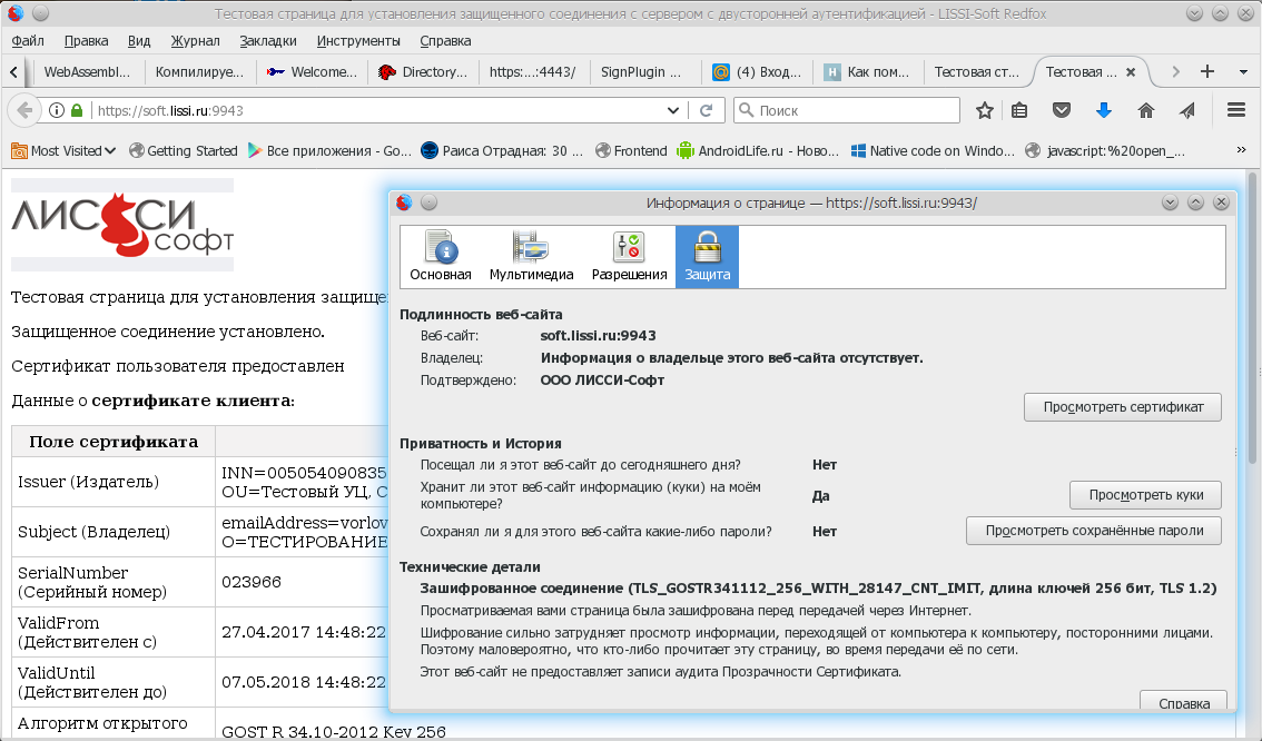 В качестве примера рассмотрим доступ к тестовой странице (https://soft.lissi.ru:9443 или https://soft.lissi.ru:9943), демонстрирующий использование https в авторизованном режиме с российской криптографией.