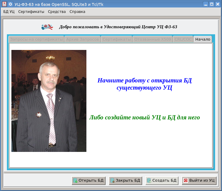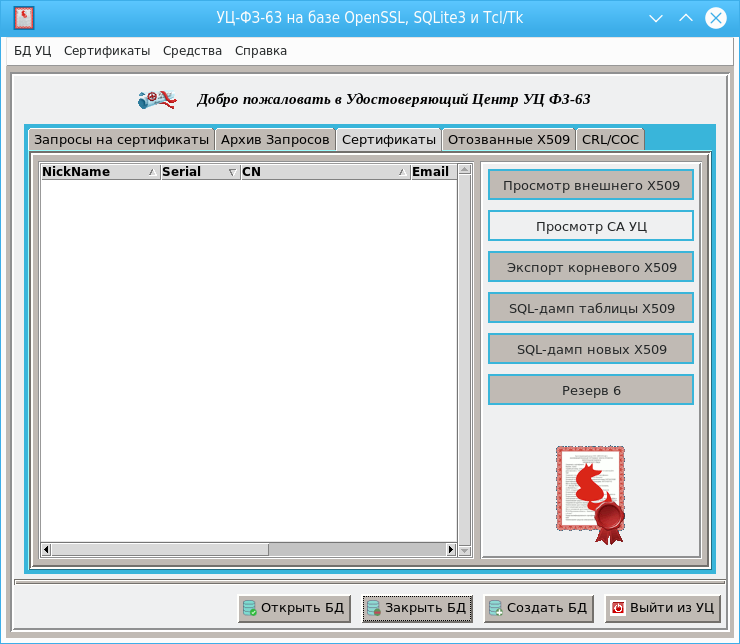 Удостоверяющий центр имеет графический интерфейс, разработанный на Tcl/Tk.