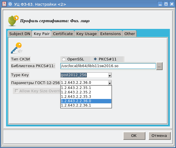 Ключевая пара может создаваться как как средствами СКЗИ "ЛИРССЛ-CSP" (кнопка OpenSSL) и сохранятся в файле, так и на токене PKCS#11 (кнопка PKCS#11). В последнем случае необходимо также указать библиотеку для доступа к токену(например, rtpkcs11ecp для токена RuToken ECP или ls11cloud для облачного токена).