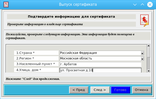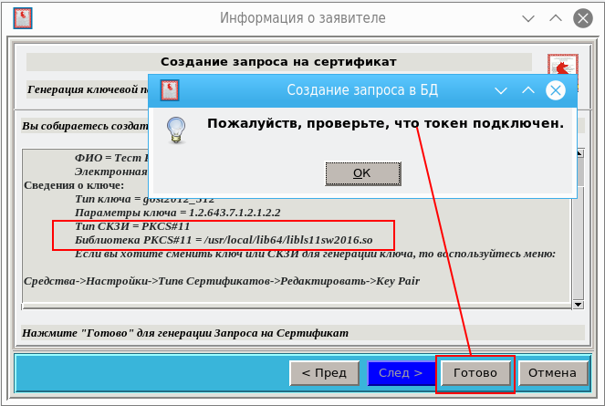 После того, как вы определились с профилем и нажали кнопку «След», дальнейшая процедура мало чем отличается от выпуска корневого сертификата. Одно важное замечание: запомните место хранение закрытого ключа и пароль для доступа к ключу. Если в качестве СКЗИ для генерации ключевой пары используется токен/смаркарта PKCS#11, то необходимо его доключить к компьютеру: