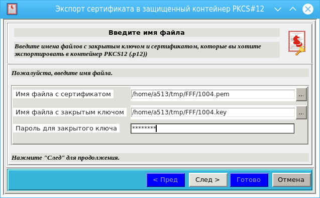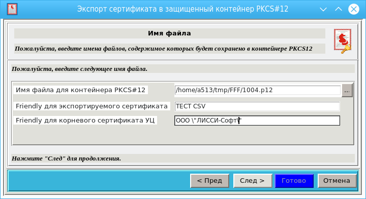 контейнера PKCS#12 файл с закрытым ключом заявителя уничтожается.