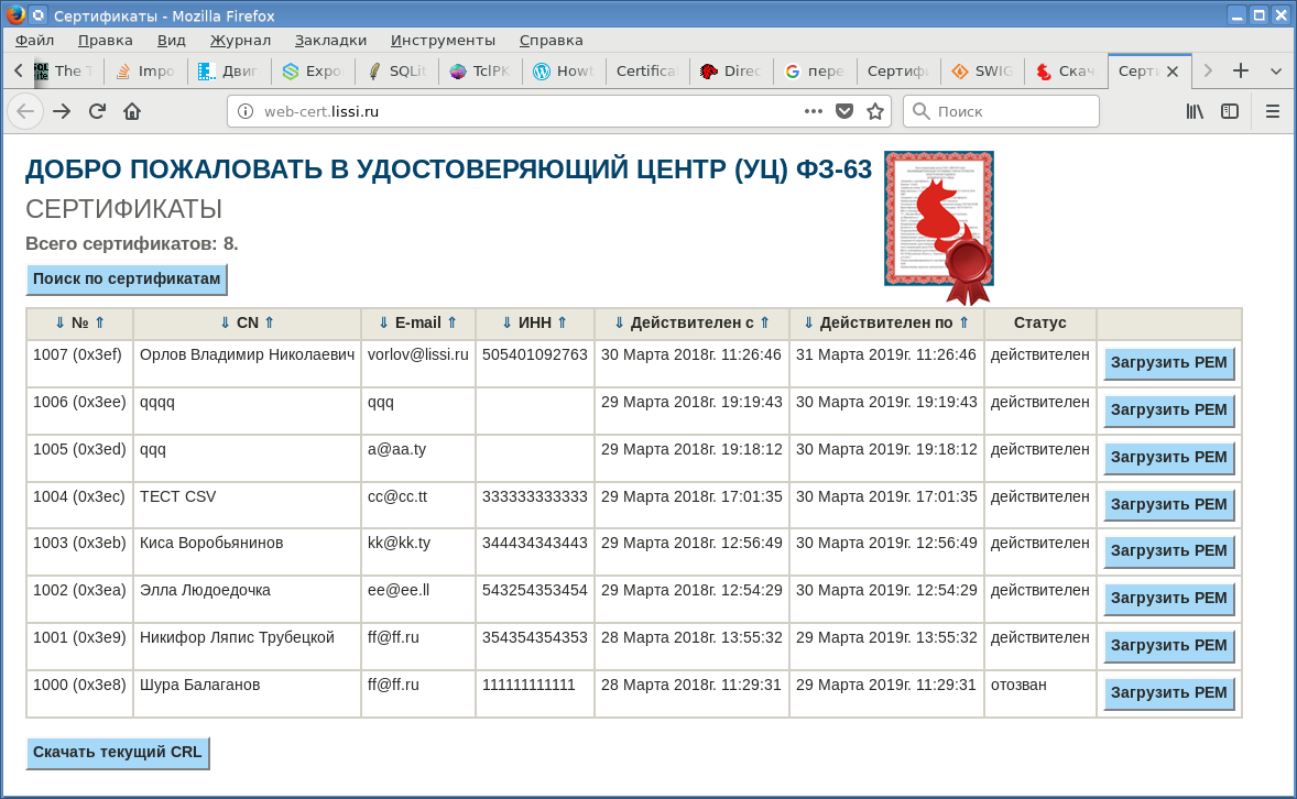 CAFL63 - Удостоверяющий Центр на базе СКЗИ «ЛИРССЛ-CSP», SQLite3 и Tcl/Tk