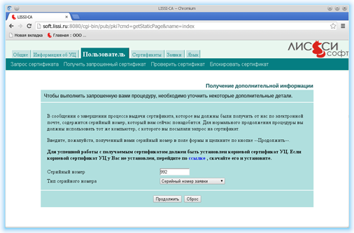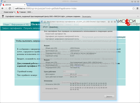 - Получать и устанавливать сертификаты, выданные по запросу используя либо плагин LCSignPlugin либо встроенные механизмы;