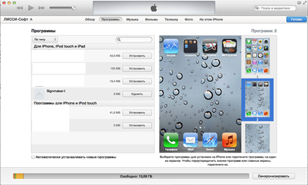 - Сделайте двойной клик по скаченному файлу Signmaker-I.ipa - автоматически откроется iTunes. Далее следует открыть вкладку программы в медиатеке и на значке программы «SignMaker-I» нажать кнопку «Установить»;